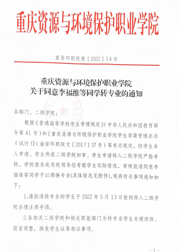 关于同意李福维等同学转专业的通知