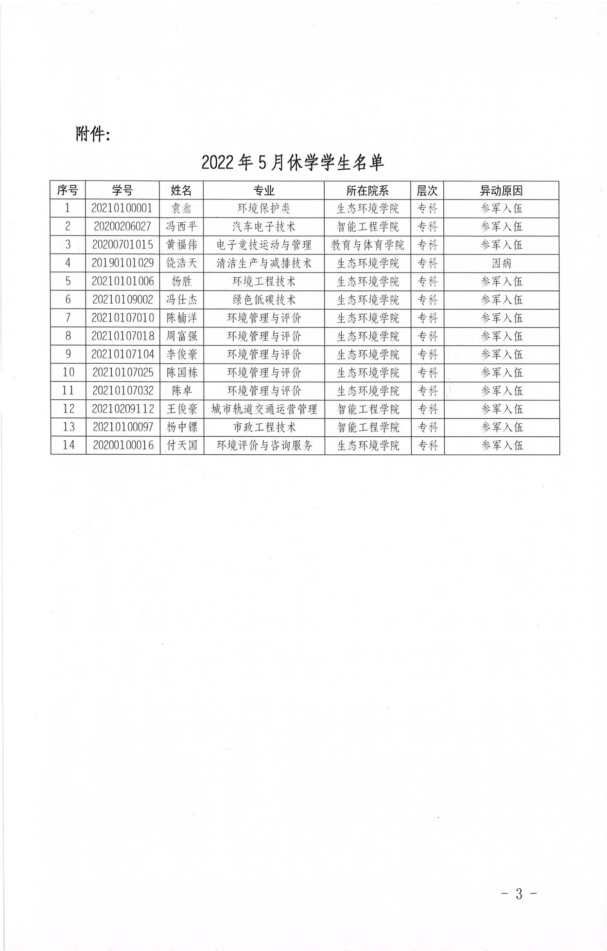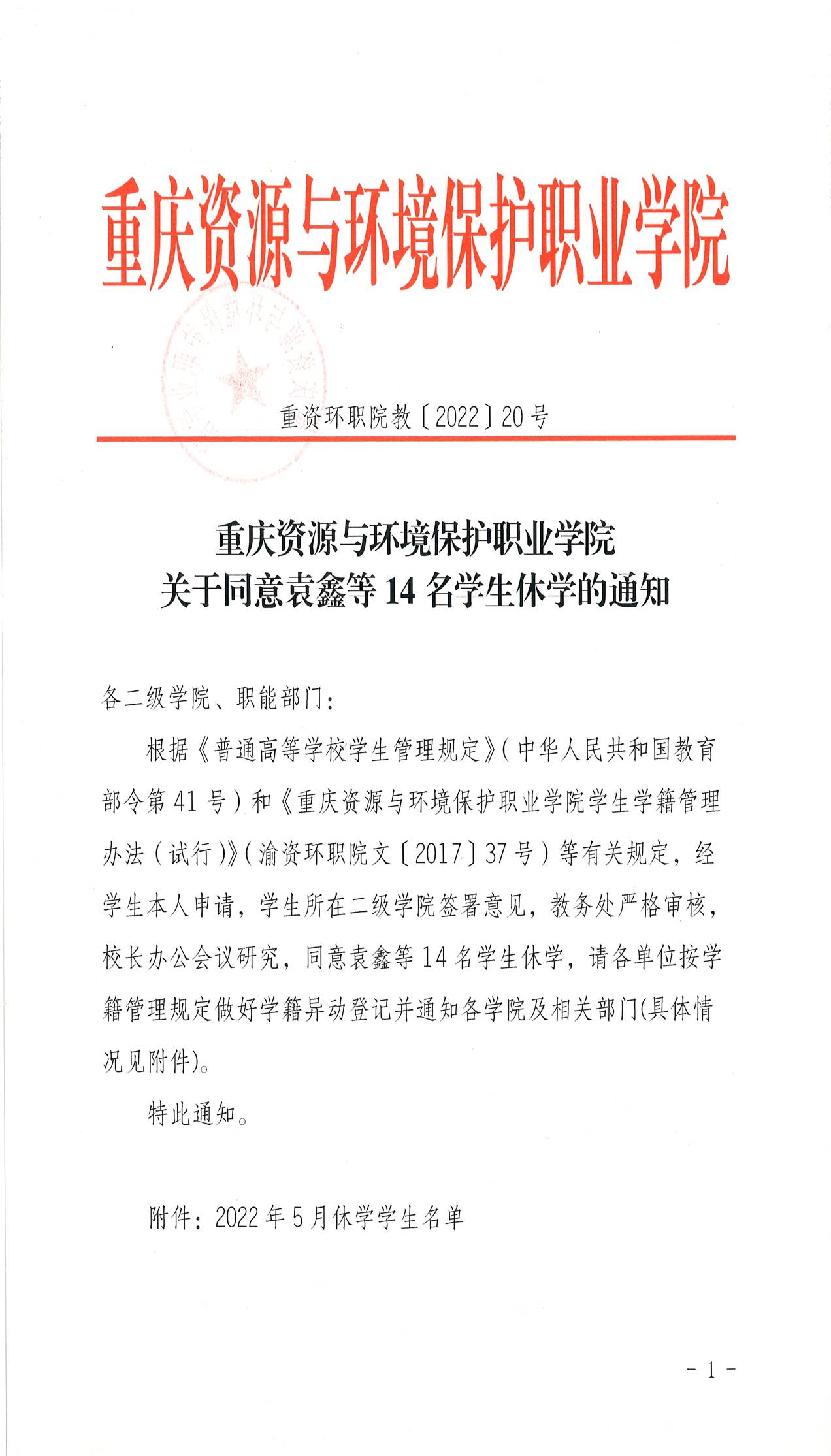 关于同意袁鑫等14名学生休学的通知