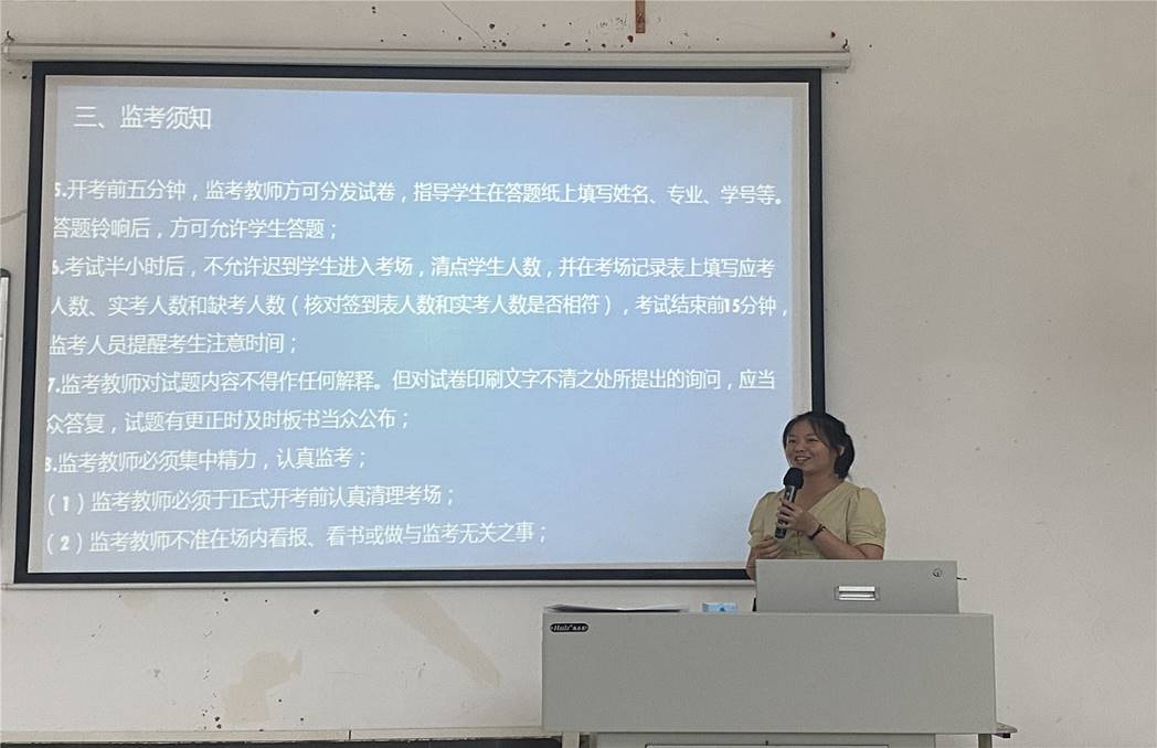教务处副处长刘志超强调,各二级学院要做好学生的考前培训工作,杜绝考试作弊的思想和行为;监考教师要严明考纪,严抓考风,,考后要认真统计学生成绩等工作;考务人员要严格规范,耐心细致地做好各项工作,确保本期期末考试各项工作安全顺利进行。