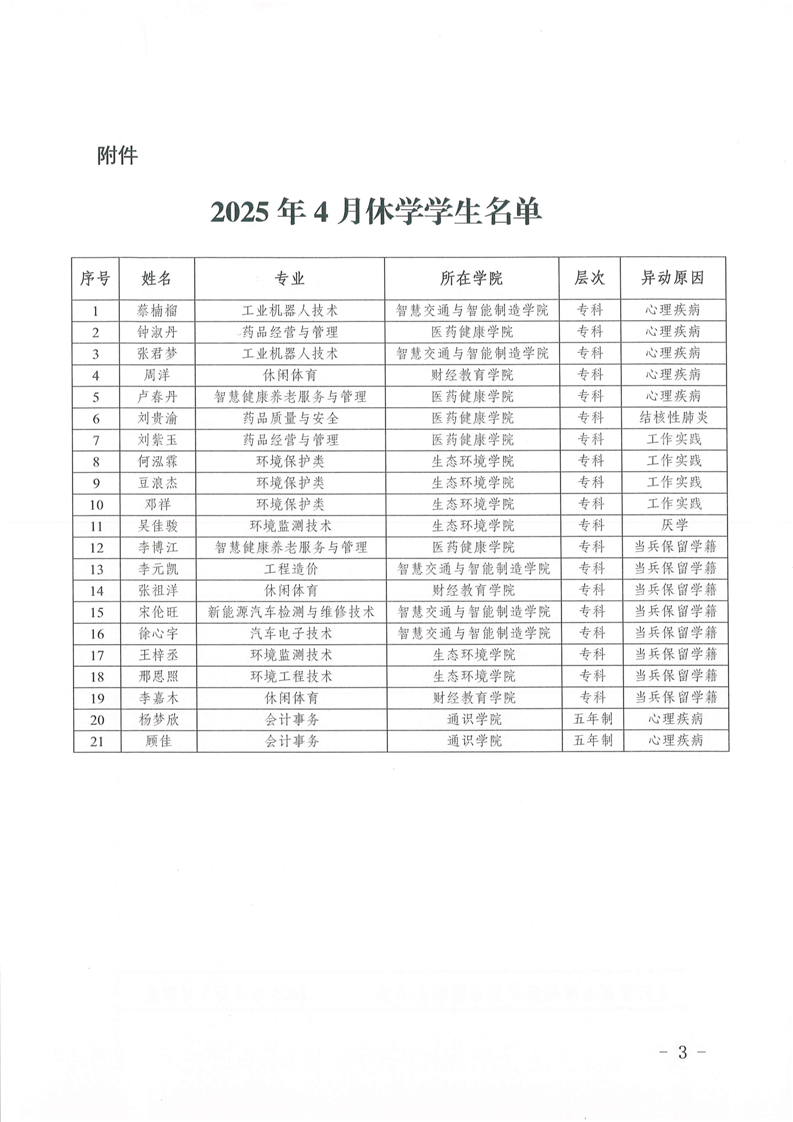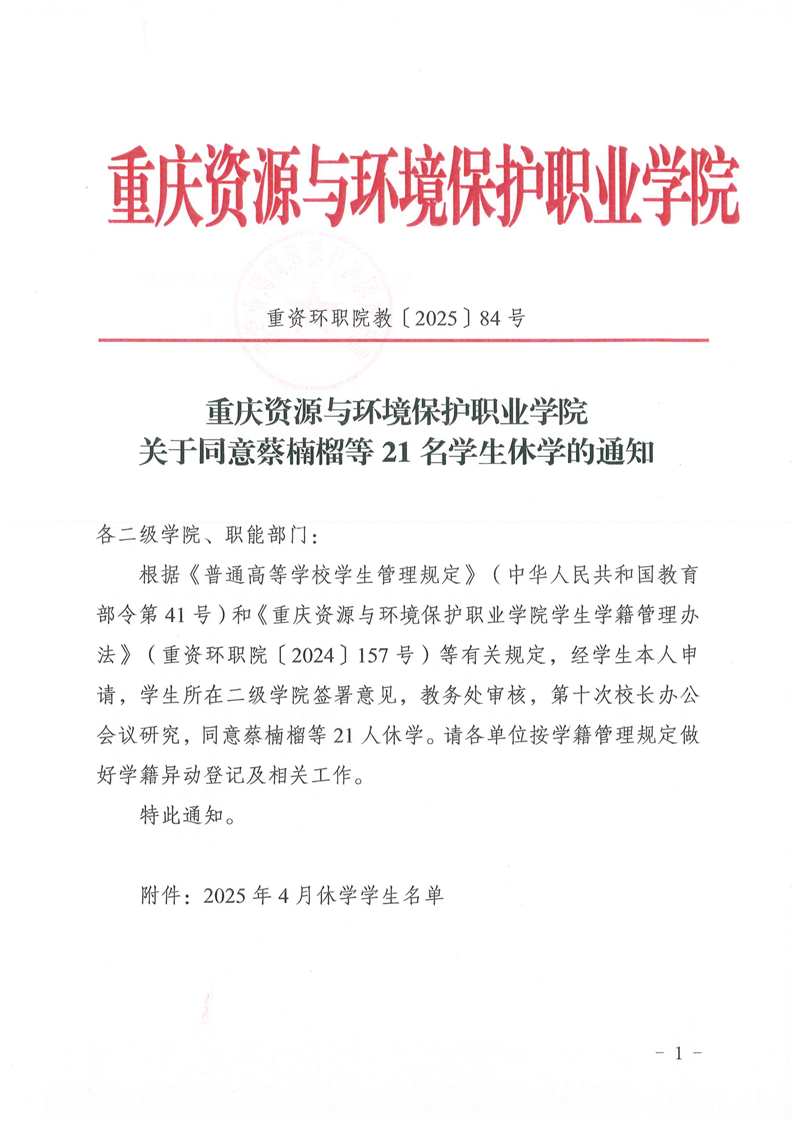 关于同意蔡楠榴等21名学生休学的通知
