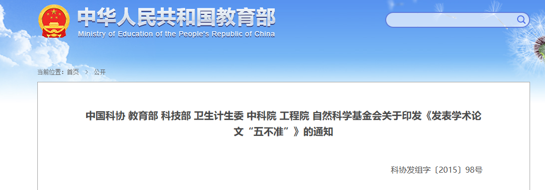 中国科协 教育部 科技部 卫生计生委 中科院 工程院 自然科学基金会关于印发《发表学术论文“五不准”》的通知(科协发组字〔2015〕98号)