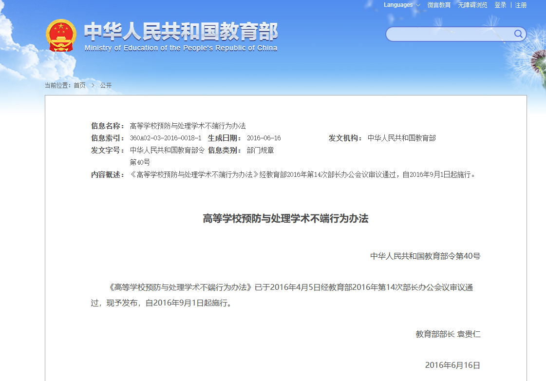 高等学校预防与处理学术不端行为办法(中华人民共和国教育部令第40号)