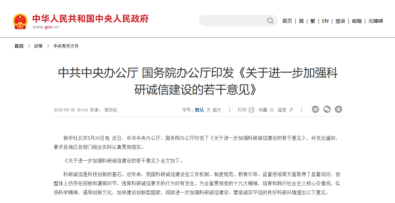 中共中央办公厅 国务院办公厅印发《关于进一步加强科研诚信建设的若干意见》