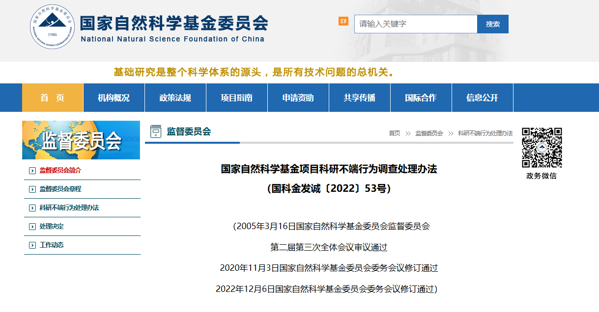 国家自然科学基金项目科研不端行为调查处理办法(国科金发诚〔2022〕53号)