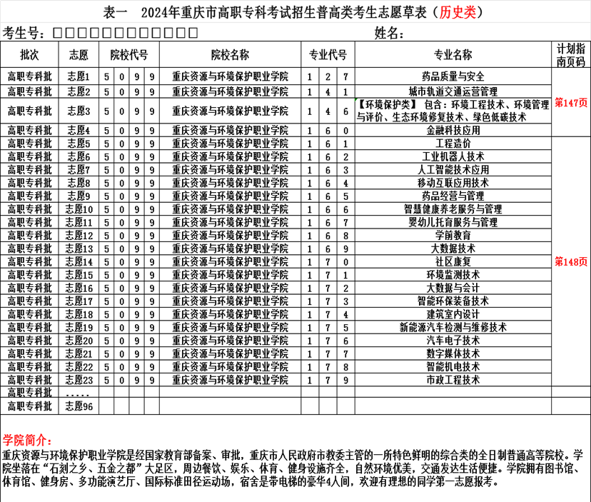 重庆资源与环境保护职业学院院校代码:5099第一志愿填报录取机率大优质专业挑有“钱”途的热门专业就业广的重点专业前景好的特色专业重庆资环职院全都有录取专业不喜欢符合条件可申请调换专业志愿填报示例及页码导航【志愿填报时间】6月27日9:00——6月30日18:00温馨提示:请各位同学在规定的时间内填报,切勿错过填报时间。