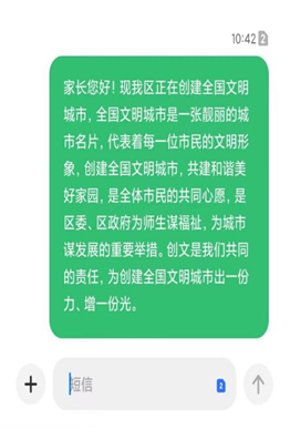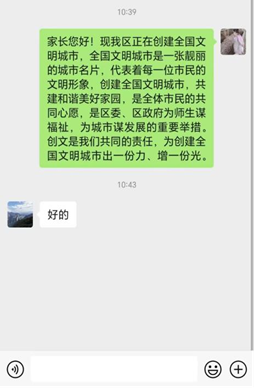 生态环境学院于3月27日开展了创文创卫线上宣传活动,该活动主要以短信的形式向学生家长宣扬大足区在“创文创卫”中所作出的努力,同时希望能家校联合,共同参与我市“全国文明城市”、“国家卫生城市”的创建活动,用自己的文明言行为大足增添亮丽的风景。