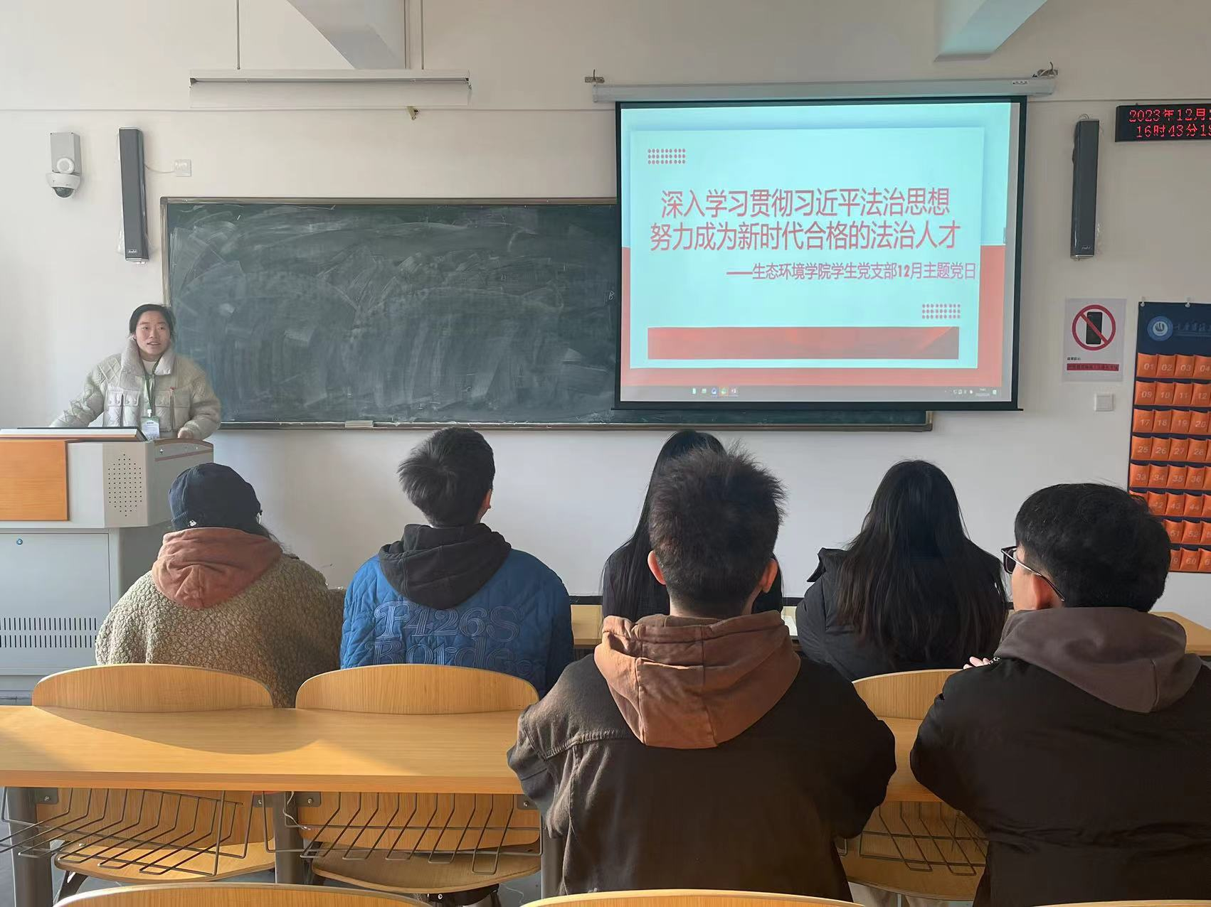 2023年12月20日,生态环学院学生党支部组织召开了以“深入学习贯彻习近平法治思想 努力成为新时代合格的法治人才 ”为主题的党日暨廉政党课活动。活动由支部书记唐成兰主持,支部全体党员参加活动。