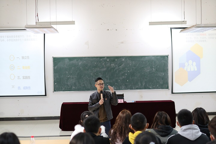 会上,匡灿结合自己大学时期的亲身经历展开讲解,要求学生们做好学生中的“领头羊”,他强调大学是我们踏入社会的最后的一站,更是锻炼自己,提高能力的宝贵沃土。它给我们提供多条途径,让每位同学能够充分的展示才华,提高能力,而担任学生干部则是其中的重要一种途径,高校学生干部包含的独立性、专业性、实践性、成熟性等特殊性质与中小学学生干部有着显著区别,在发挥表率作用、纽带作用、能力作用等方面具有更高要求,它要求高校学生干部应以身立教,为人楷模,把学生紧紧地吸引和团结在自己的周围。同时,学生干部要注意培养自己的事业心,自觉认识自己所从事的学生工作的重要意义,明确自己所肩负的重托,增强责任意识和服务意识,保持旺盛的工作热情,兢兢业业,积极工作。匡灿就学生干部工作流程、基本方法和必须掌握的五大内容作了详细说明并祝愿全体学生干部取得学习和工作“双丰收”。