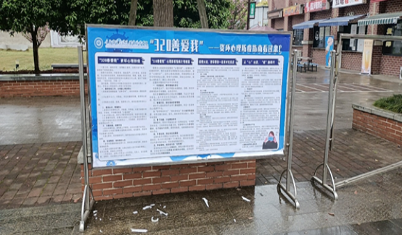 学生处心理咨询中心制作了心理宣传横幅,以内容为“疫路成长 善爱自我”、疫路成长,从心出发,阳光心态,善爱自我”、“世界很大,幸福很小,希望如约而至不止春天,还有朝向阳光拥抱快乐的你”。以及心理防疫宣传栏。