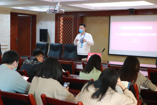 为加强辅导员在心理工作中的专业性、实效性,继续提升辅导应对心理突发事件的能力,4月20日上午10:00,我校心理健康服务中心组织了“2022年春季辅导员心理服务能力”第二场培训。培训由心理健康中心贾海灵主持,团委书记、学生处副处长张斌、各二级学院书记及全体在校辅导员在行政楼第一会议室参加了培训活动。