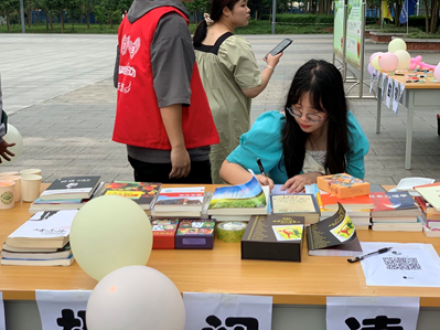 心理协会的干部认真登记同学们对心理书籍的借阅情况。