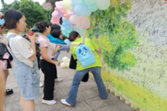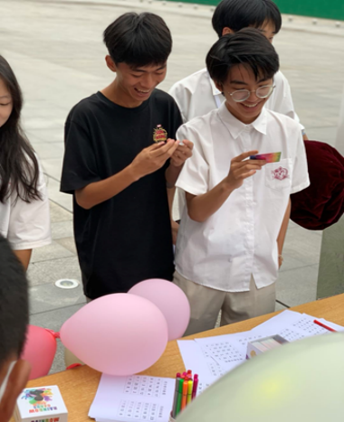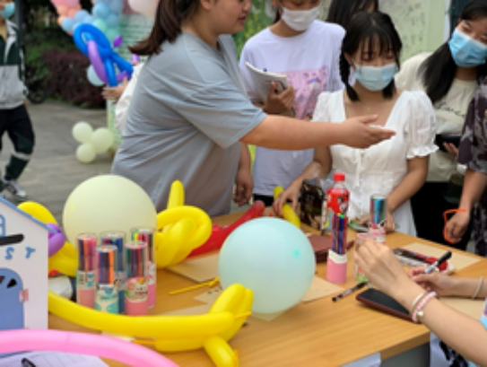 2户外运动挑战活动,主要有专注力训练的舒方格游戏、情感宣泄的分贝测试、意志力培养的的吹乒乓球游戏,以及增加团体凝聚力的运送气球游戏在完成游戏后,通过挑战的同学可以获得绿植奖励一份。通过户外趣味活动与心理学知识相结合的形式培养学生的心理学素养。