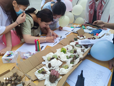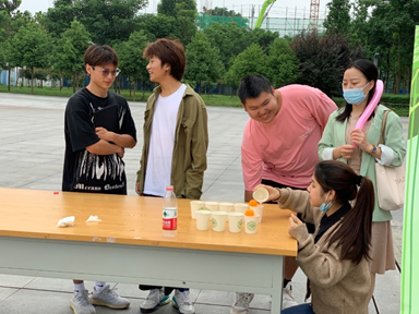2户外运动挑战活动,主要有专注力训练的舒方格游戏、情感宣泄的分贝测试、意志力培养的的吹乒乓球游戏,以及增加团体凝聚力的运送气球游戏在完成游戏后,通过挑战的同学可以获得绿植奖励一份。通过户外趣味活动与心理学知识相结合的形式培养学生的心理学素养。