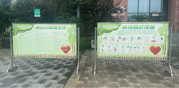 1户外宣传活动,主要有横幅标语、心理知识宣传展板、展板集体签名校园广播“心灵之声”的宣传形式,在轻松愉悦、放松身心的状态下,倡导大学生学会自我关怀,悦纳自己。