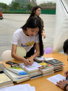 心理协会的干部认真登记同学们对心理书籍的借阅情况。