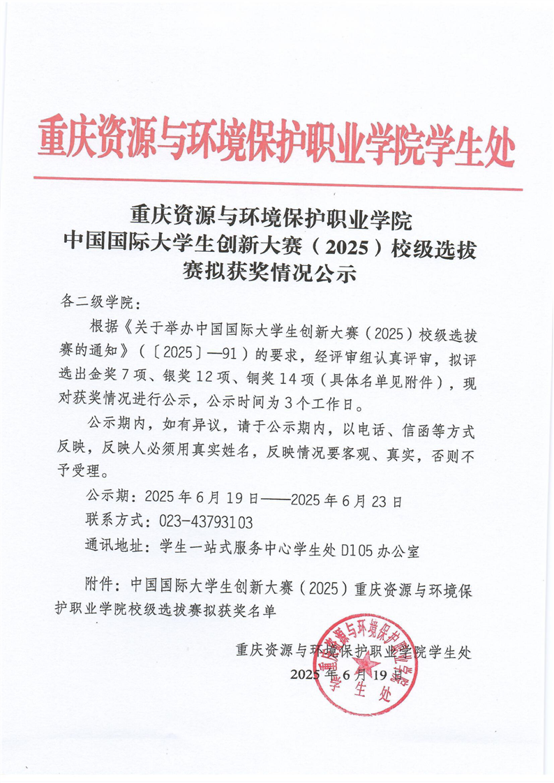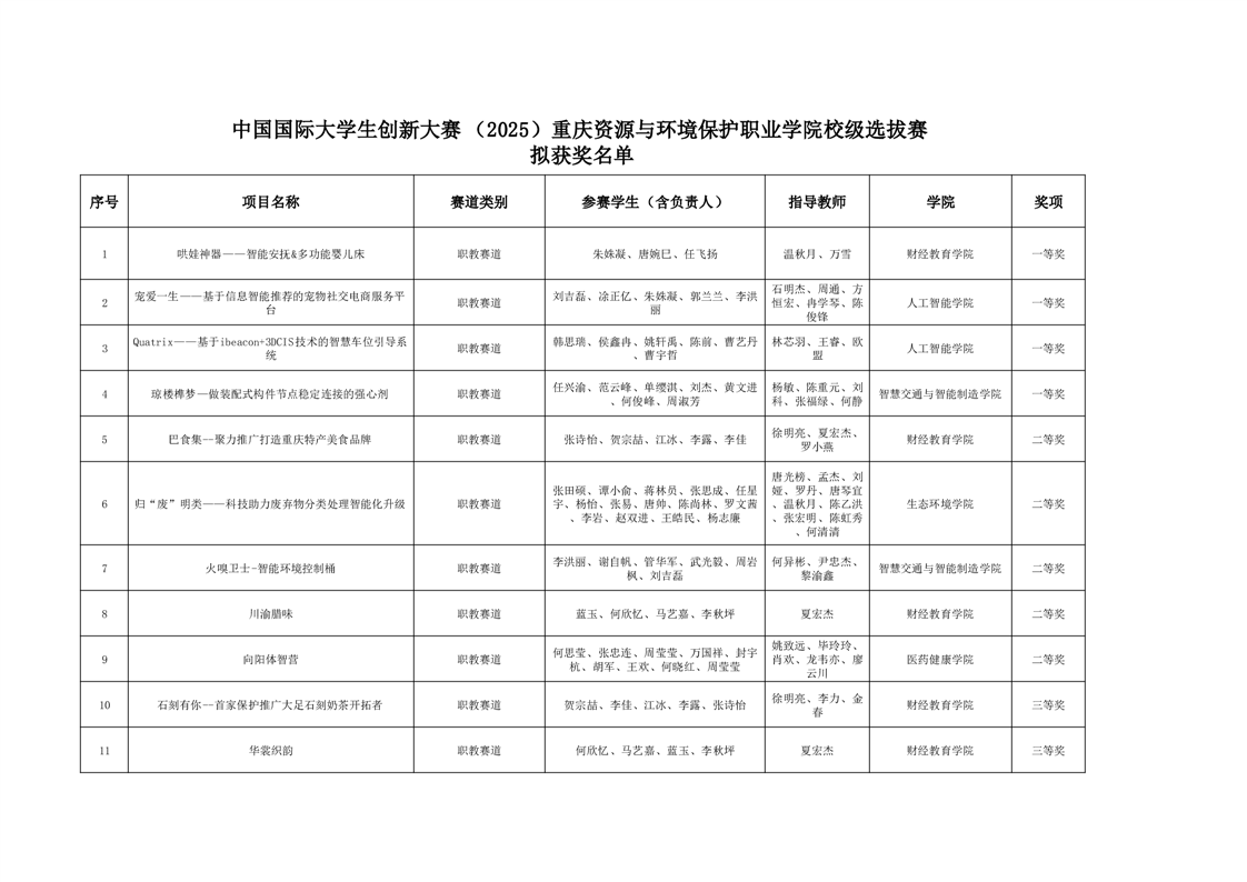 重庆资源与环境保护职业学院中国国际大学生创新大赛(2025)校级选拔赛拟获奖情况公示
