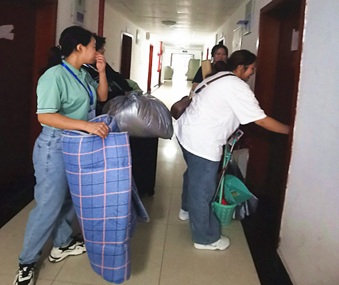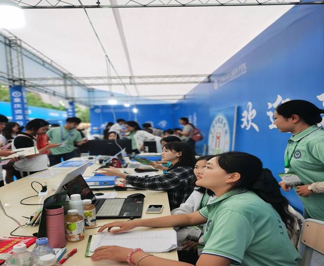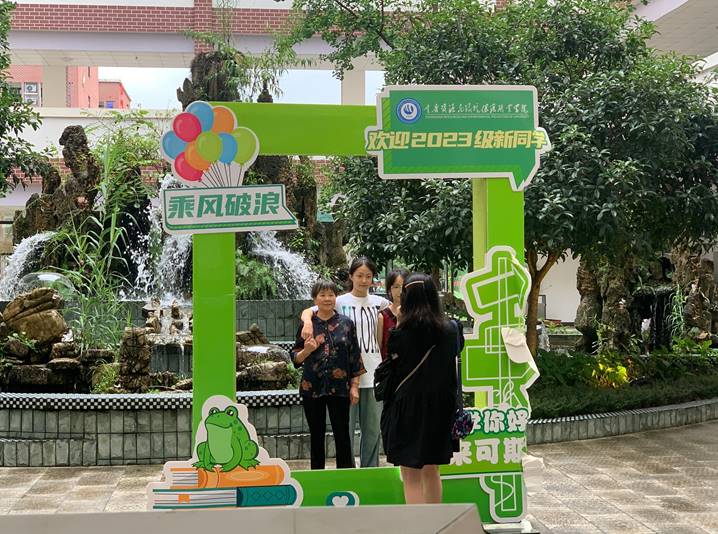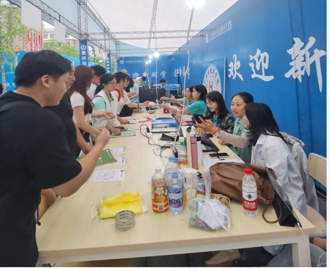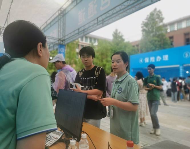 新生们一进校门,就被一面面彩旗、一条条迎新横幅这隆重热烈的喜庆氛围吸引,一群群“蓝”精灵穿梭在新生和家长人群中,热情细致地引导每一位新生完成所有报到流程。为了做好迎新工作,管理与健康学院领导精心部署,分工明确,要求全体教职工齐上阵——引导组、注册组、专业咨询组、宿舍分配组、行李搬运组、军训物资发放组等师生志愿者们循环往复,为新生们做好入校第一天“一条龙服务”!