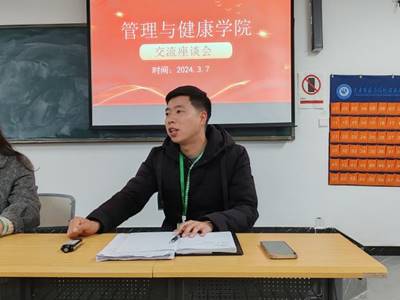 3月7日晚19:00,我院在XJ109教室组织召开学生交流座谈会。为进一步贯彻以“学生为中心”的宗旨,倾听学生心声,回应学生所关切的问题,助力学生成长,收集学生对学校教育、管理、服务等方面的意见和建议,提升学生的幸福感、获得感和满意度。本次会议由管理与健康学院党总支书记赵茂森主持。