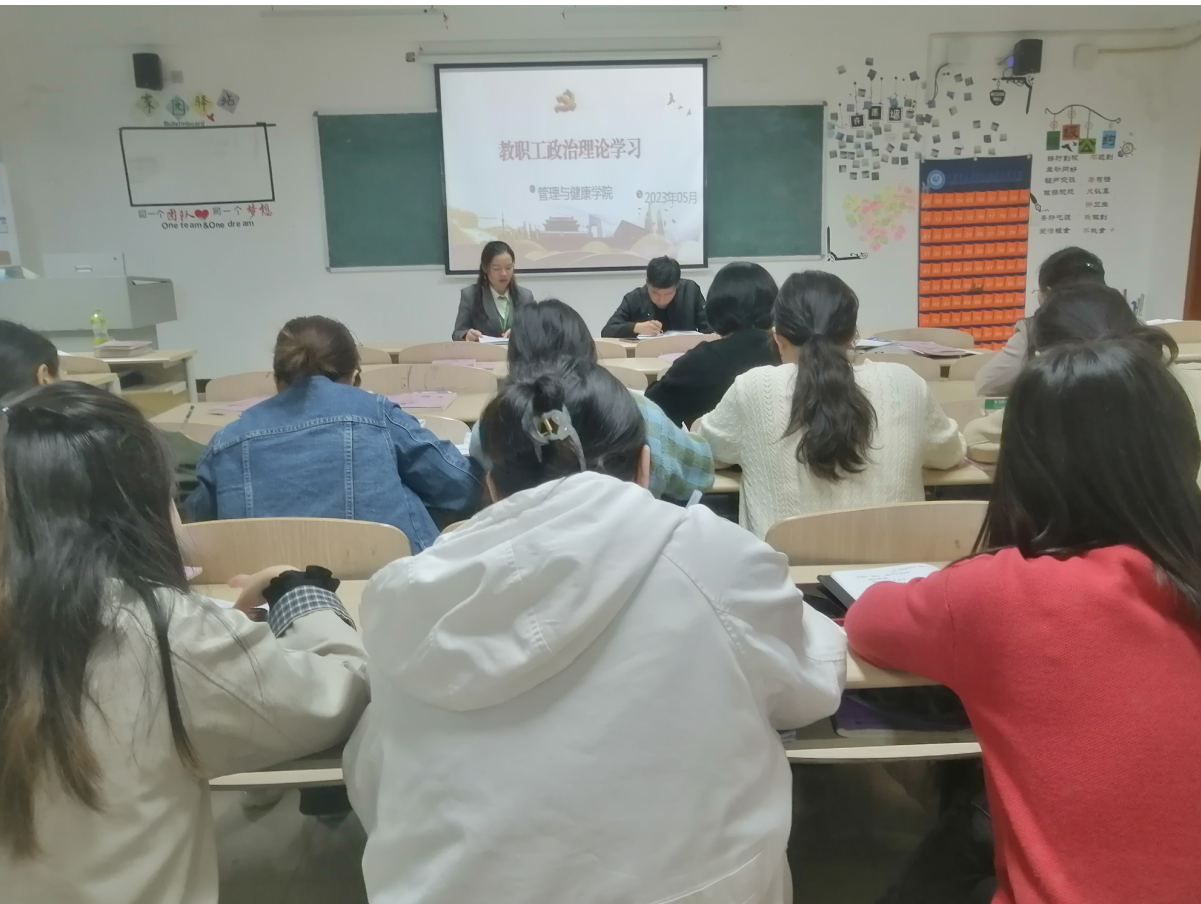 为进一步深入贯彻党的二十大精神,学习习近平新时代中国特色社会主义思想,根据《中共重庆资源与环境保护职业学院委员会教职工政治理论学习实施意见》和学校工作安排,管理与健康学院于5月10日,在J411开展了5月教职工政治理论学习,学院全体教师参加,会议由管理与健康学院院长唐红英主持。会上集中学习了习近平同志《加快构建新发展格局把握未来发展主动权》的讲话,《习近平在学习贯彻习近平新时代中国特色社会主义思
