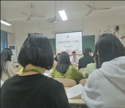 根据《中共重庆资源与环境保护职业学院委员会2023年4月组织生活学习指导意见》的相关要求,管理与健康学院于2023年4月10日,在J411开展了主题为“持续深入学习二十大精神”的4月教职工政治理论学习,学院全体教师参加,会议由管理与健康学院院长唐红英主持。会上集中学习了习近平新时代中国特色社会主义思想主题教育工作会议有关精神,习近平总书记在第十四届全国人民代表大会第一次会议上的讲话,习近平总书记