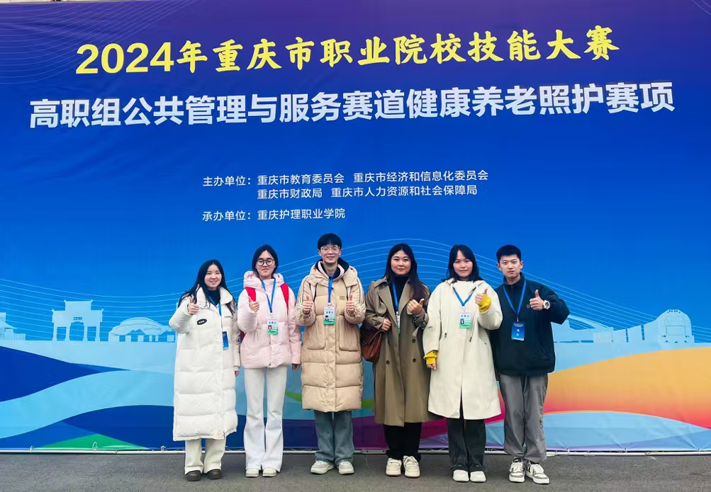1月6日-7日,由重庆市教育委员会、重庆市经济和信息化委员会、重庆市财政局、重庆市人力资源和社会保障局主办的2024年重庆市职业院校技能大赛“高职组公共管理与服务赛道---健康养老照护赛项”在重庆护理职业学院举行。我校医药健康学院教师唐红英、罗小燕、蒋达庆、秦薇带领智慧健康养老服务与管理专业8名学生(1队:代曹婷、王官燚、黄雪艺、汪海燕;2队蒲佳艺、胡军、向群、阚鑫宇)参赛,经过激烈角逐,两支队