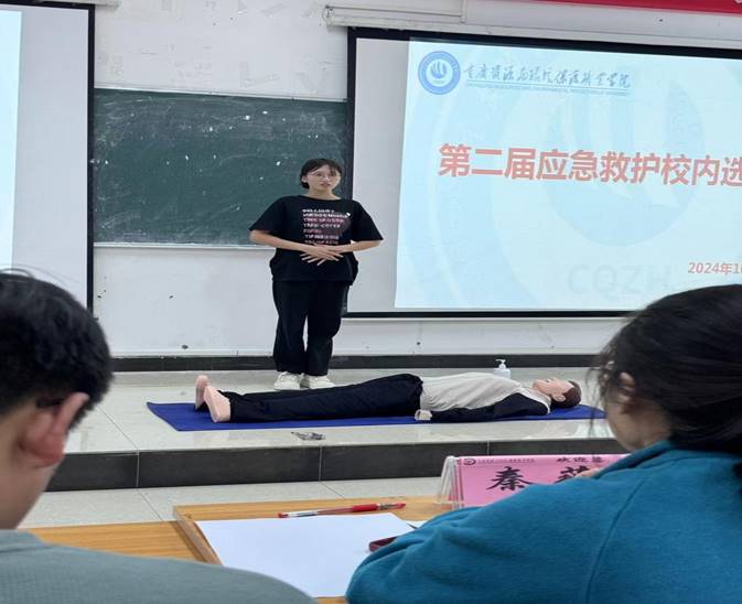 2024年10月16日管理与健康学院在S113举行了第二届重庆市应急救护校内选拔赛,本次大赛秉承“练技能、提素养、展风采、树形象”理念,不断增强应急救护意识,提升大学生应急救护能力,在他人或自己面临突发创伤及生命威胁时能够积极展开急救及自救。本次比赛分为心肺复苏和包扎转运两个竞赛单元,两项得分相加为最终成绩。有13名选手参加了选拔比赛。竞赛现场气氛紧张激烈,参赛选手沉着冷静、动作规范,展现了较好