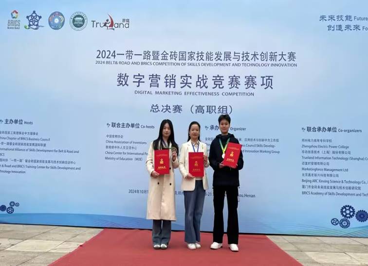 10月18-21日,2024一带一路暨金砖国家技能发展与技术创新大赛数字营销全国总决赛(高职组)在郑州举行。经过前期选拔,全国共有160支队伍进入总决赛。经过激烈角逐,我校管理与健康学院岳瀚槭、唐红英老师指导的2022级大数据与会计专业学生罗金池、门凌园斩获全国总决赛二等奖。金砖国家技能发展与技术创新大赛(简称“金砖大赛”)是2017年金砖国家最高领导人会晤筹备委员会认可、经中华人民共和国外交部