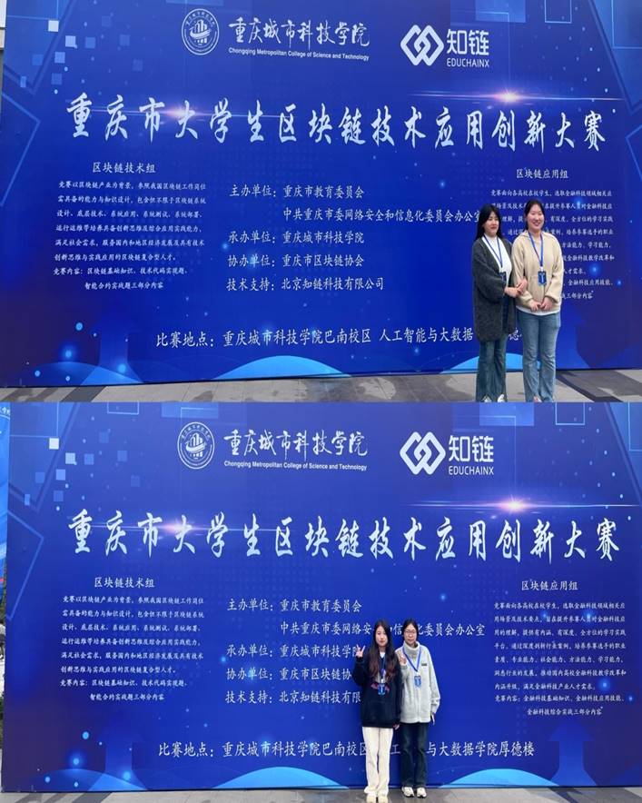 近日,2024年重庆市大学生区块链技术应用创新大赛在重庆城市科技学院顺利举行。此次大赛共有来自重庆地区高职院校35支队伍参赛。经过激烈角逐,我院管理与健康学院金融专业参赛队伍喜获重庆市(高职组)大赛三等奖两项。图1:参赛学生合影据悉,本次大赛由重庆市教育委员会、中共重庆市委网络安全和信息化委员会办公室主办,重庆城市科技学院承办,重庆市区块链应用创新产业联盟协办。区块链作为新兴数字产业,在产品溯源