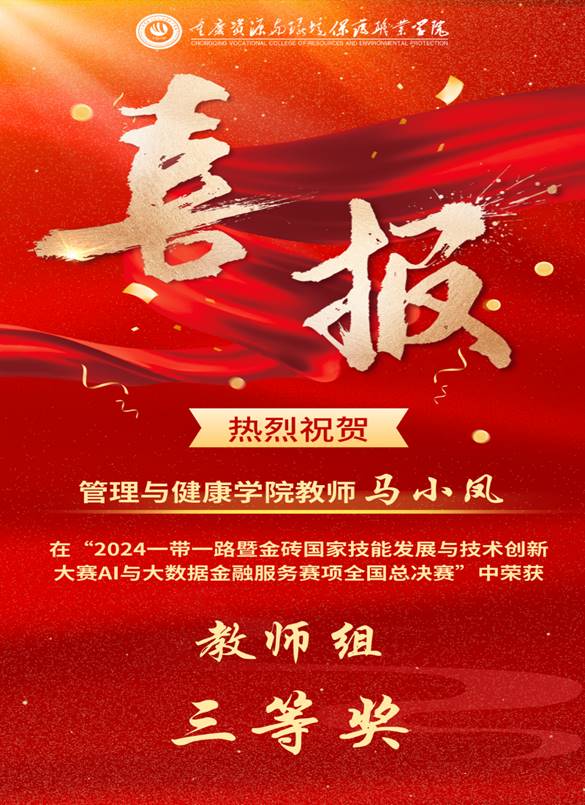 11月9日—10日,2024一带一路暨金砖国家技能发展与技术创新大赛之AI与大数据金融服务赛项全国总决赛在江西财经职业学院举办。经过初赛选拔,全国有45名教师进入决赛。此次赛事聚焦“一带一路”沿线国家及金砖国家的金融创新发展,参赛者们围绕AI与大数据在金融服务领域的应用展开角逐,通过精准营销、智能信贷管理、数字财富管理等模块展示了各自的专业水平和创新能力。经过激烈角逐,管理与健康学院教师马小凤荣