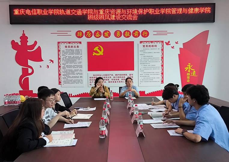 为营造良好的班级氛围,激励学生们向好向上发展,5月9日上午,我校管理与健康学院与重庆电信职业学院轨道交通学院开展了班级班风建设交流会。本次交流会由重庆电信职业学院杨鑫老师主持,我校胡亭老师以及学生代表参会。会议开始前,班委代表们罗列出了学生们早晚自习迟到、早晚自习期间随意进出教室、在早自习上吃早餐等需要交流的问题。会议开始后,班委们还在日常出勤考核、群消息免打扰设置、对通知的人称等的修改、反馈制