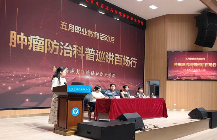 肿瘤防治科普巡讲现场为积极响应重庆市教委及学校关于开展五月职业教育活动月相关要求,加强与校企合作单位的学术交流。5月22日下午,管理与健康学院邀请到重庆医科大学附属大足医院肿瘤科主任李冲团队,结合其科室开展的“肿瘤防治科普巡讲百场行活动”,在学术报告厅开展了肿瘤防治科普专题讲座,旨在加强肿瘤的“早预防、早发现、早诊断、早治疗”理念,倡导大家养成健康的生活方式。管理与健康学院院长唐红英担任主持,全