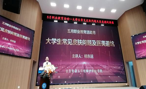 重庆东上医疗美容门诊部杨东运教授在5月25日“国际爱肤日”到来之际,结合学校5月职业教育活动和学院特色,管理与健康学院为引导全校师生关注和关爱皮肤健康,5月23日下午在学术报告厅举办了“大学生常见皮肤问题及医美避坑”专题讲座,本次讲座邀请到校企合作单位重庆东上医疗美容门诊部杨东运教授团队授课,讲座期间互动积极,反响热烈。讲座现场讲座中,杨东运教授从医学专业和临床经验出发,围绕痤疮及其防治、皮肤外
