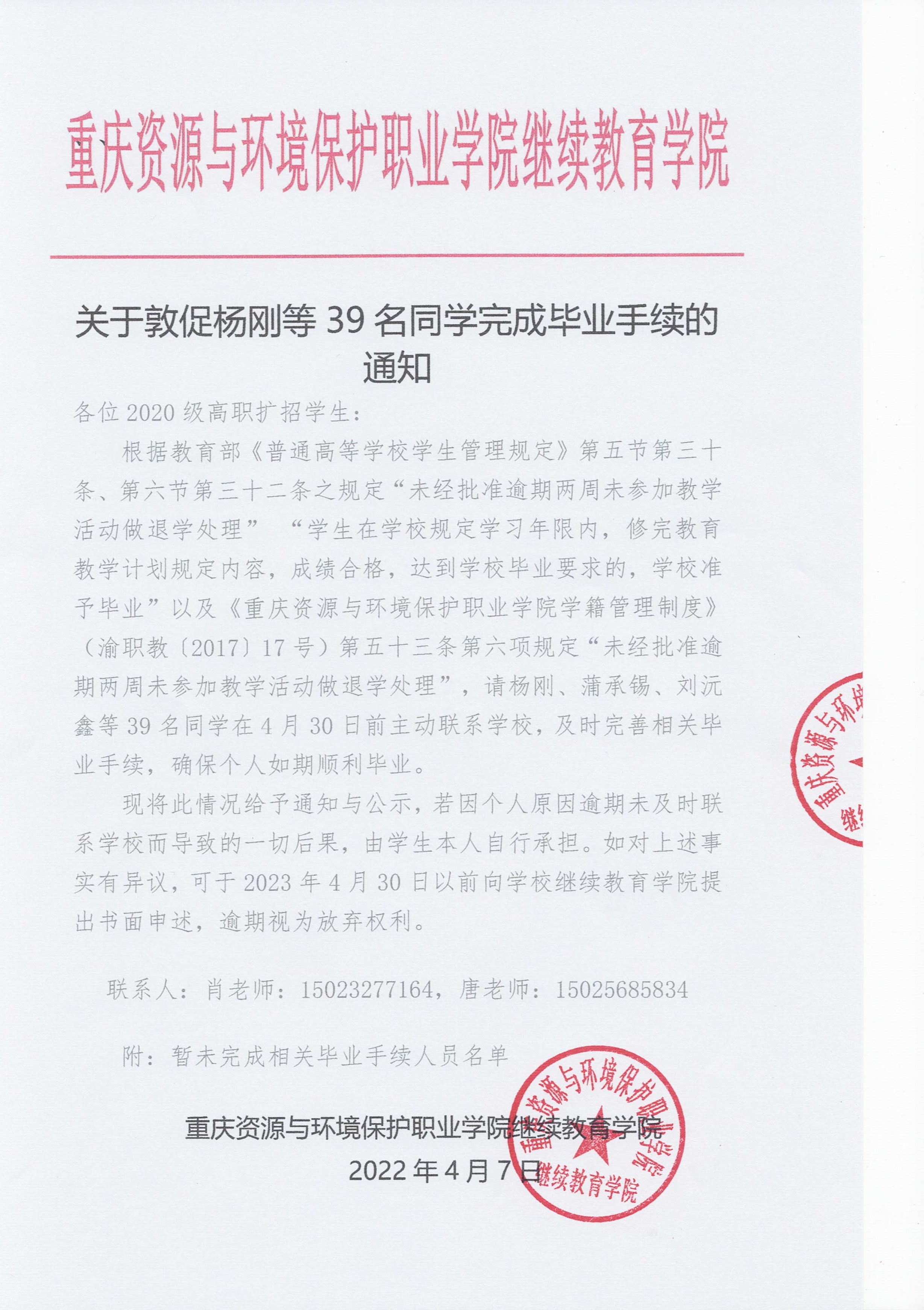 关于敦促杨刚等39名同学完成毕业手续的通知