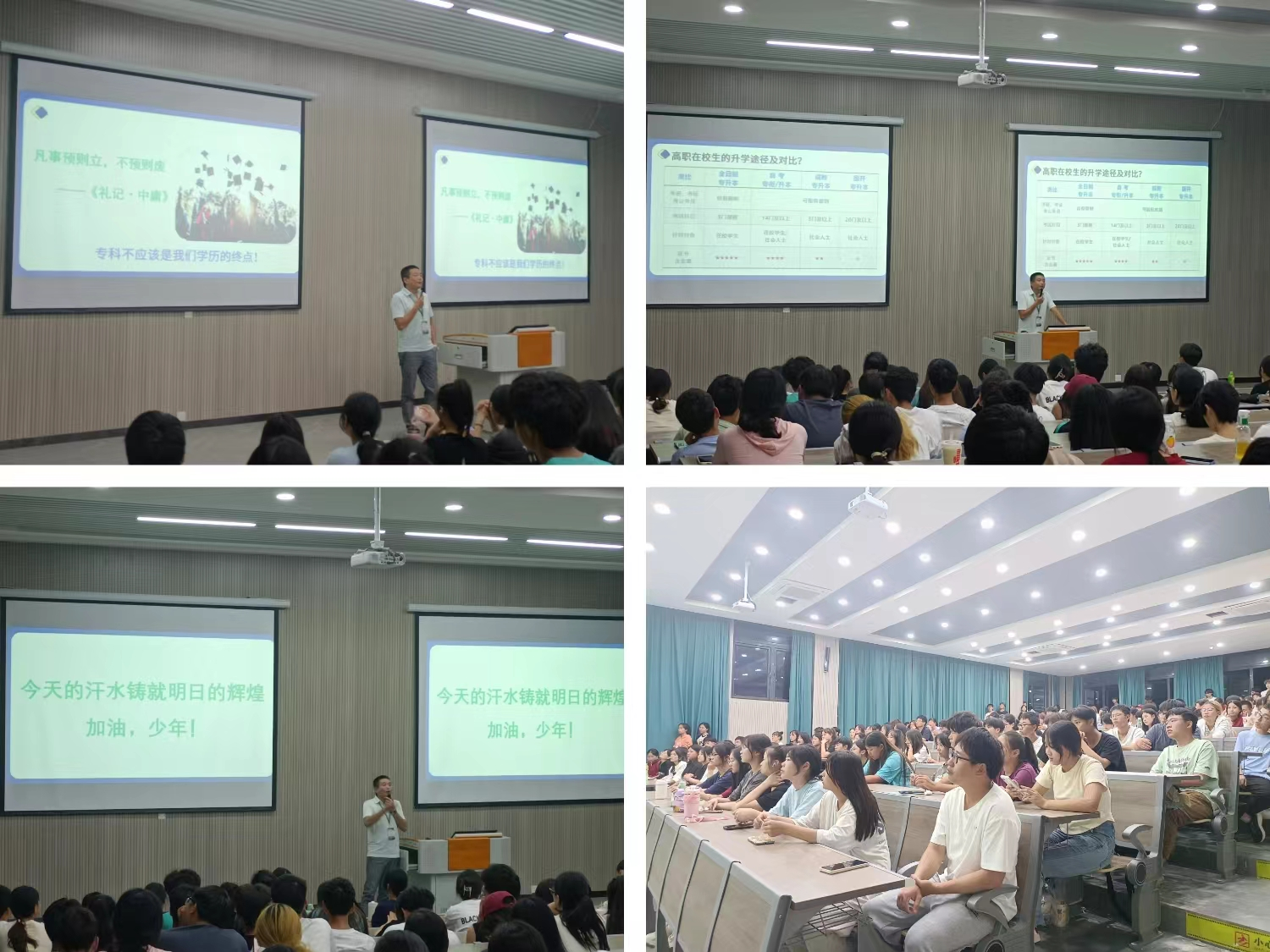 陈院长从“面试三连问”步入主题,他首先介绍了现实生活中学历的重要性,列举近年来大学生就业情况的官方数据,给同学们分析了目前的就业形势。他指出,当今时代国家不断推行优质、公平教育,坚决反对唯学历论、唯“985、211论”,同学们只要通过自己的努力提升自己,个个都能绽放光彩!并结合我校学生的实际情况,对专升本、自考专衔本、成教专升本、国家开放大学专升本等4类提升学历途径进行了具体分析和比较,重点讲述了专升本、专衔本两种提升学历的方法。他鼓励新生,一定要规划好自己的成长之路,努力提升学历,抓住再次深造的机会增强自身实力和竞争力。