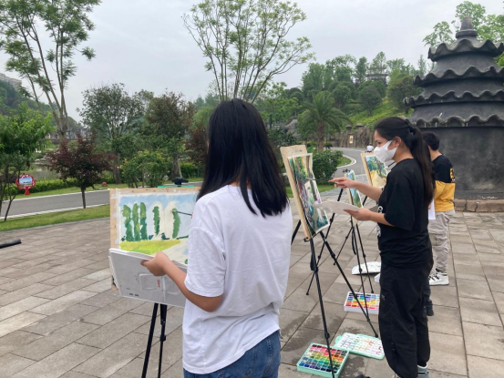 大足区几大公园风景优美,山明水秀,更具有大足文化的独具风情。同学们在两位老师的带领下,很快融入到公园大好山水之间,用笔墨色彩寄情于一幅幅画面中。两位老师也以高度的责任心进行此次课外教学。他们现场示范和指导学生写生,晚上还要对学生的作品进行精心讲评,帮助学生及时改进写生技巧和创作思路。