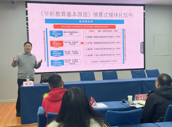 在培训期间,来自重庆各高职院校的52位教师齐聚一堂进行分享与讨论,共同学习了重庆师范大学黄英副教授的《岗课赛融合促学生发展:基于全国职业院校技能大赛幼儿教育技能赛项的解读与思考》、西南大学西南大学教师教育学院杨挺教授的《基于 OBE 的课程大纲与教学实践》、重庆师范大学魏勇刚教授的《学前教育新型智库的时代意蕴与建设路径》、四川幼儿师范高等专科学校一系侥卉教授的《高职学前教育专业项目式教学的设计与实施——以,<幼儿园艺术教育与活动指导>为例》、川南幼儿师范高等专科学校二系冯丽副教授的《虚拟仿真项目式教学助力保教高质量发展——以<学前卫生学>为例》、重庆青年职业技术学院江可老师的《功不唐捐,玉汝于成——“青焦”从 0 到 1 的成长之路》、重庆航天职业技术学院张芝的《高职学前教育专业“岗课赛证”融合的在线精品课程建设 ——以幼儿园教育活动设计与指导为例》、重庆师范大学蔡红梅的《研究课题申报与实施》、重庆幼儿高等师范专科学校学前教育学院易俊英副教授的《全国职业院校技能大赛幼儿教育技能赛项的组织与指导》、徐州幼儿师范高等专科学校学前与特殊教育学院刘曲副教授的《师范专业认证背景下高职学前专业理论课程建设与实施策略》等11场精彩的面授讲座。7天时间,本次培训聚焦高职学前专业的专业建设,师范专业认证、全国职业院校专业技能大赛,课程建设、课题申报与教育研究等内容,专家们出彩的讲授让学员们学习热情高涨,同时在专业建设方面的思考甚多。运用各类交流模式相互切换、现场观摩、针对专家抛出问题进行“头脑风暴”探究相结合的方式开展培训,使学员们更加深入感受到培训的必要性,从而达到了举办本次培训的初衷与目标。