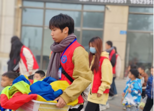 志愿者杨成与志愿者刘帅为幼儿园搬领物资