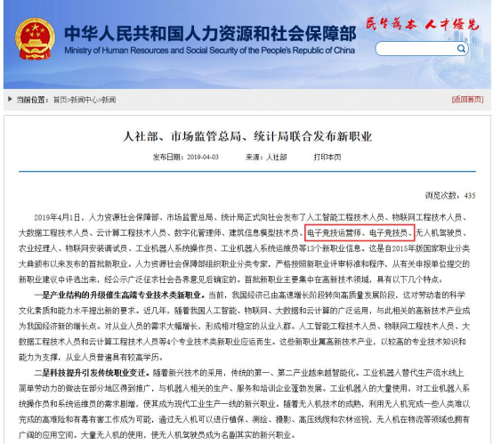 2019年4月1日,人力资源社会保障部、市场监管总局、统计局正式向社会发布了13个新职业信息,其中与电子竞技行业相关的新职业有电子竞技运营师和电子竞技员两项,引发了社会各界极大的关注。这是自2015年版国家职业分类大典颁布以来发布的首批新职
