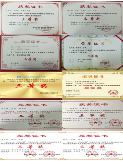近年来,为推进“岗课赛证”产教融合模式,拓展学生就业创业本领,本专业在重庆市、西部地区、全国互联网金融、金融科技、金融挑战赛、企业竞争模拟大赛、商务数据分析、金融+大数据等技能竞赛中多次荣获一、二、三等奖。