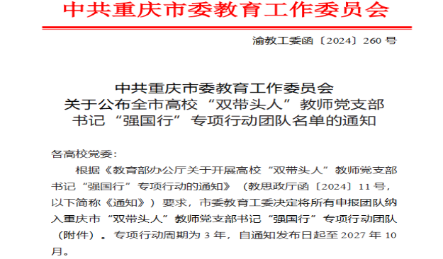 近日,中共重庆市委教育工作委员会印发了《关于公布全市高校“双带头人”教师党支部书记“强国行”专项行动团队名单的通知》,我院教师党支部成功入选。教师党支部书记谢元亭入选重庆市“双带头人”教师党支部书记。此次专项行动旨在深入贯彻落实高校“双带头人”教师党支部书记培育工作的部署要求,充分发挥高校“双带头人”教师党支部书记的示范引领作用,引导广大师生在以中国式现代化全面推进强国建设、民族复兴伟业新征程上