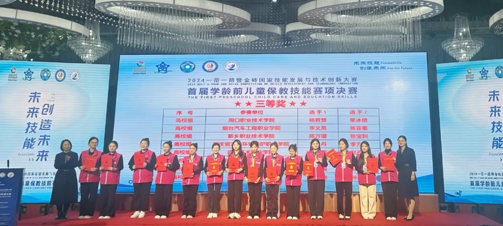 11月21日,2024一带一路暨金砖国家技能发展与技术创新大赛—首届学龄前儿童保教技能赛项决赛在潍坊市高密中等专业学校隆重举行,来自全国各地的146支参赛队伍参加决赛。经过三天激烈角逐,我校婴幼儿托育服务与管理专业学生刘丹、李方群荣获高校组三等奖。首届学龄前儿童保教技能赛项,通过Comet职业素养测评、保育技能实操、教育活动设计及模拟教学、3D模拟保教环境创设四大模块,融入现代化教学技术,以学龄