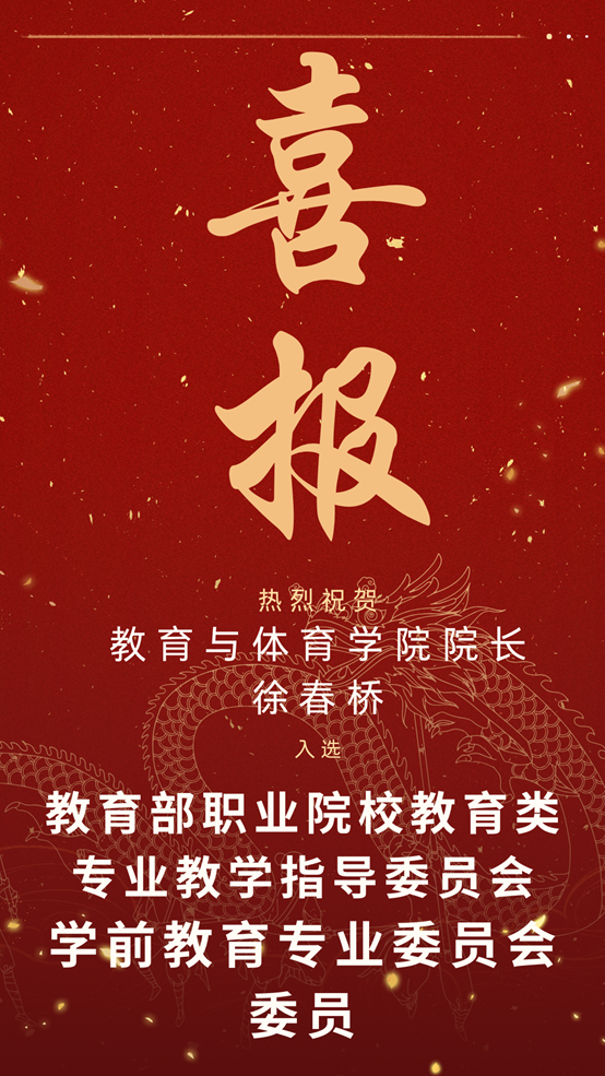 查看详情喜报!教育与体育学院院长徐春桥入选教育部职业院校教育类专业教学指导委员会学前教育专业委员会委员
