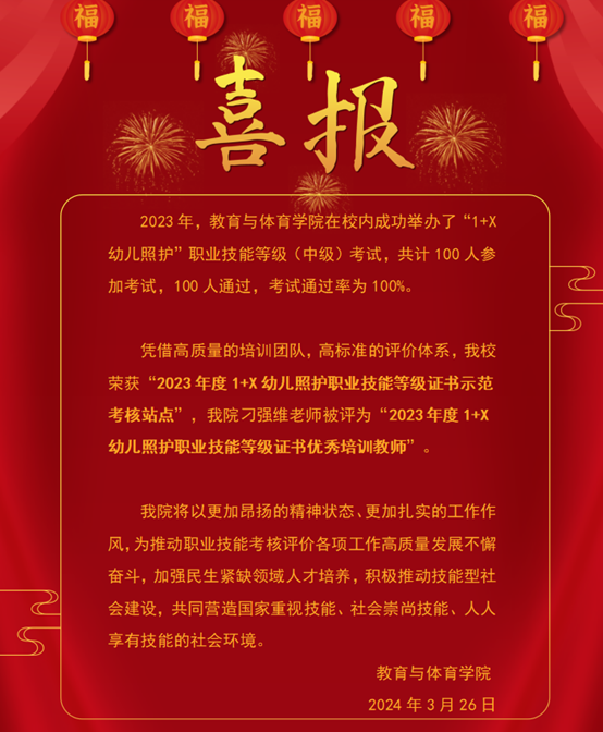 查看详情喜报—教育与体育学院2023年度1+X幼儿照护职业技能等级考试荣获佳绩
