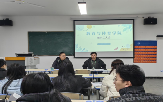 新学期如期而至,为确保新学期各项工作有序开展,2024年2月27日上午,教育与体育学院在xs606召开新学期教职工大会,教育体育学院院长徐春桥、党总支副书记焦辉超以及各教研室教师及辅导员参加了会议,会议由教育与体育学院院长徐春桥主持召开。徐春桥院长对上学期工作进行了回顾总结,在充分肯定全体教师的上期工作成绩的同时,对本学期工作进行部署,徐院长重点从专业建设、教学质量以及内部管理等方面进行了强调。