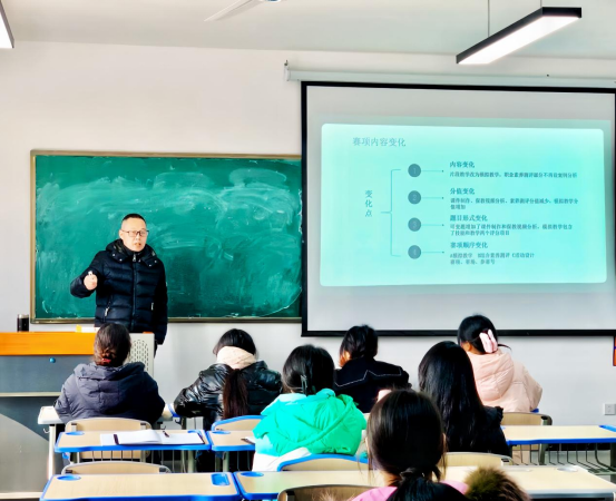 12月14日下午,教育与体育学院在XS606召开了由徐春桥院长亲自主持开展的“幼儿教育技能赛项新规程及评分标准解读专项培训”。旨在提升教师的专业素养和教学能力,推动学院教育竞赛高质量内涵式发展。在培训中,徐春桥院长围绕‘新规程解读、评分标准解析和相关建议’三个方面,为参训教师和同学们提供了详尽的指导和培训。他深入浅出地讲解了如何备战幼儿教育技能大赛,分享了比赛的经验和技巧,同时鼓励同学们积极参与