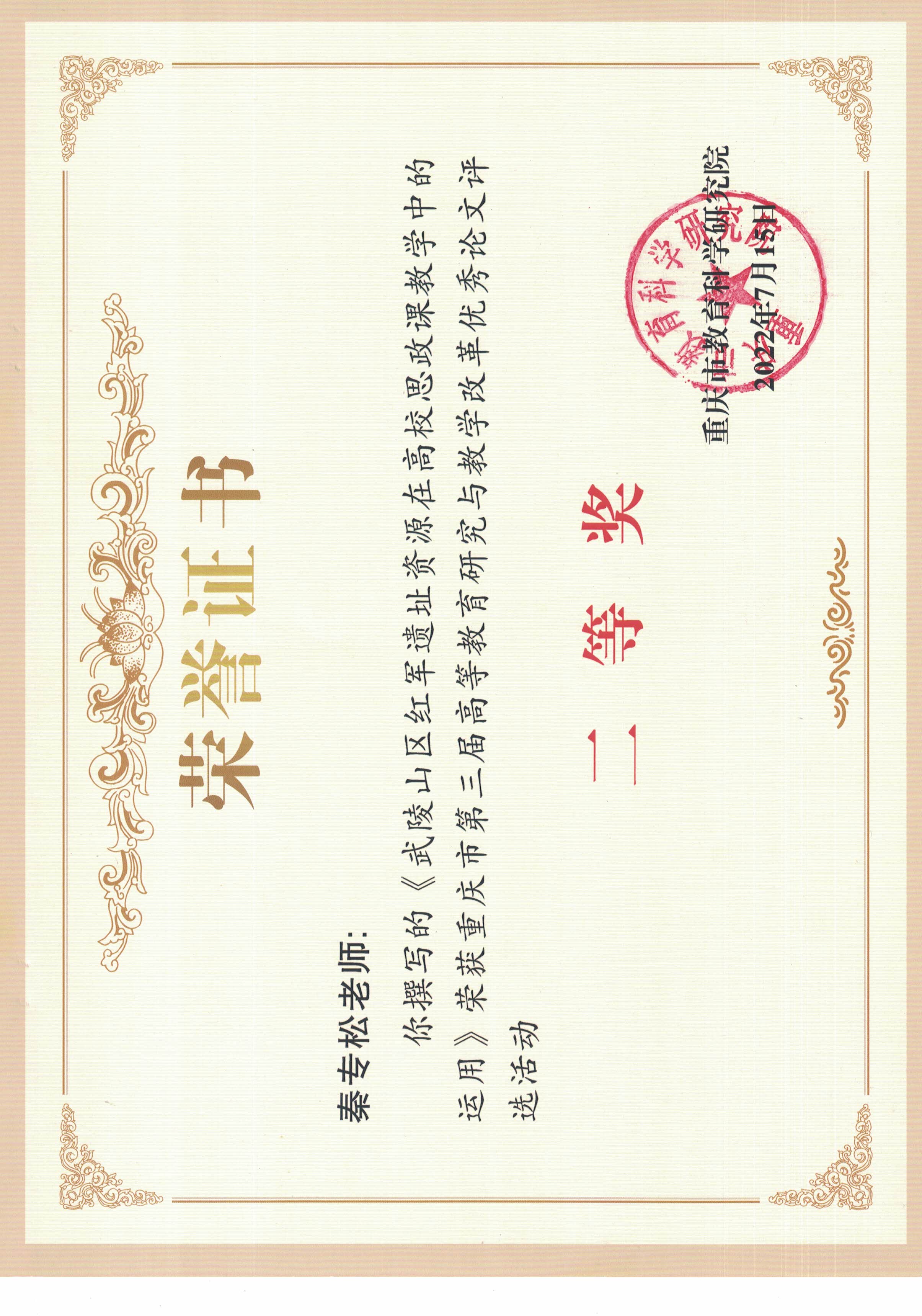 根据《重庆市教育科学研究院关于开展重庆市第三届高等教育研究与教学改革优秀论文评选活动的通知》的评选要求,围绕“传承红色基因、赓续红色血脉”的主题,我院秦专松老师的教改论文《武陵山区红军遗址资源在高校思政课教学中的运用》获得重庆市第三届高等教育研究与教学改革优秀论文二等奖。重庆市第三届高等教育研究与教学改革优秀论文评选活动自开展以来,在渝各高校引起高度重视。学院积极组织教师参赛,教师参赛论文经校内