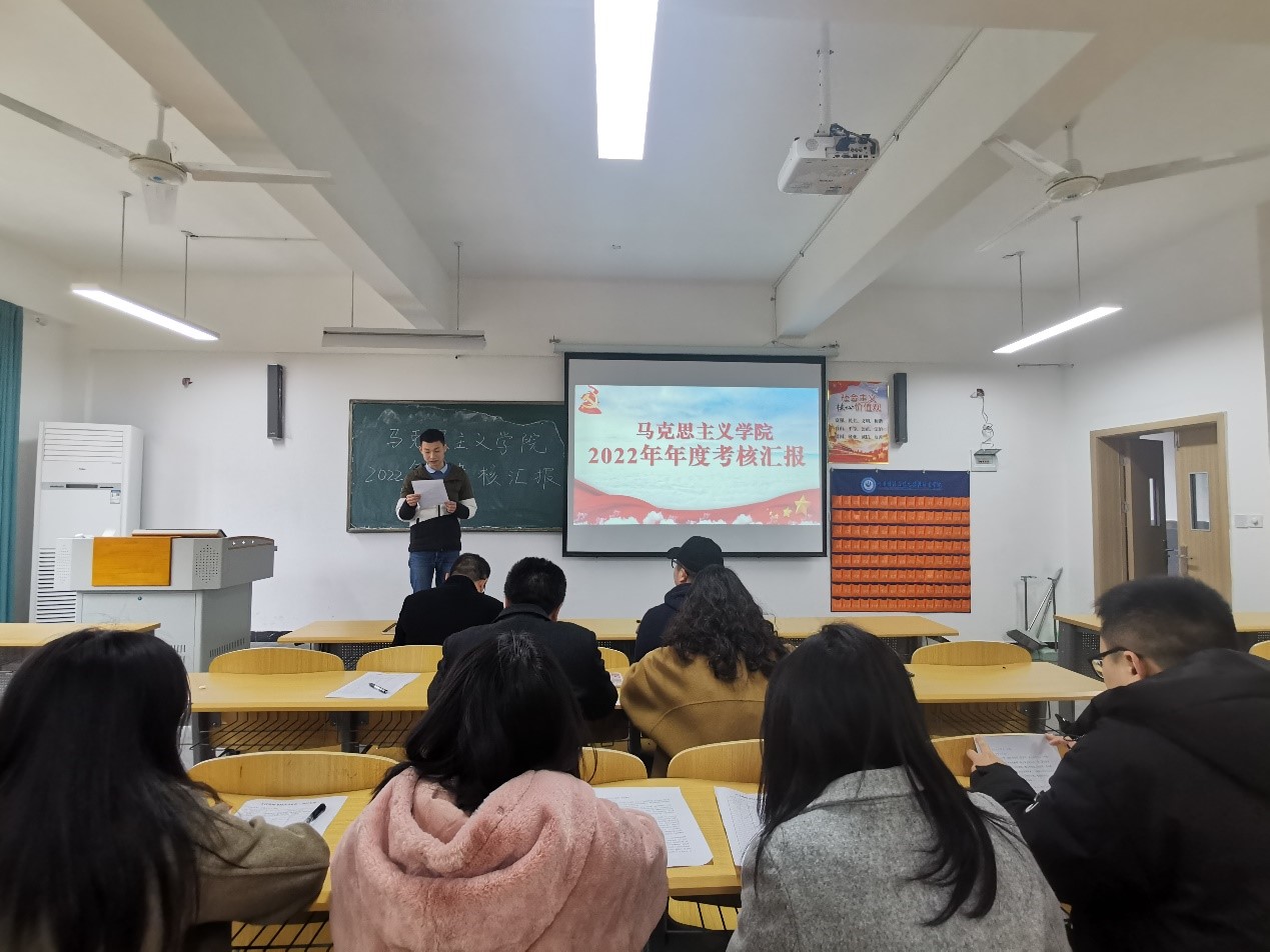 2023年3月24日下午,马克思主义学院2022年度述职大会在XJ205召开。马克思主义学院院长苟兴成、教务处副处长韩坤及马克思主义学院全体专任教师参加此次述职大会,会议由思想政治理论课教研室副主任秦专松主持。随后,学院各个专任教师依次分别从师德师风、特殊贡献、教学能力、科研能力、指导竞赛、工作态度等方面进行了2022年度的述职汇报。汇报结束后,马克思主义学院院长苟兴成在总结时提出三点要求:一是