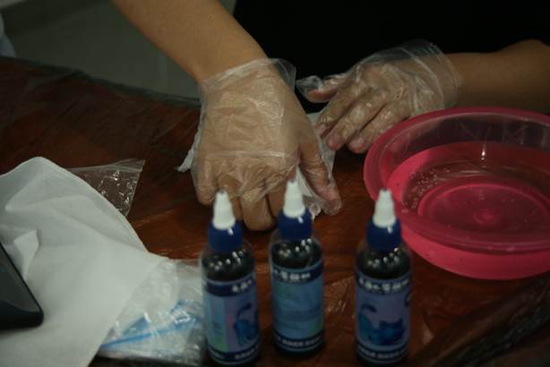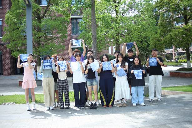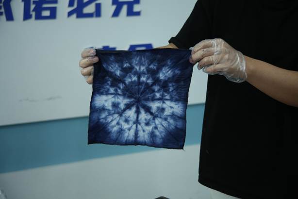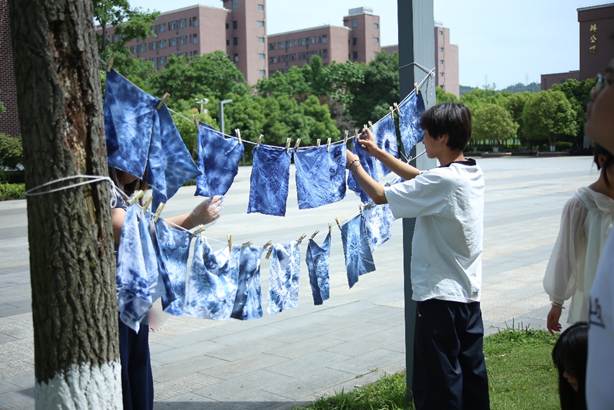 活动现场,主讲人以“一块布的蜕变”为脉络,系统介绍了扎染这一国家级非遗技艺的历史渊源与文化内涵。从扎染的“冰裂纹”美学,到捆扎、染色工序中的物理化学原理,生动讲解让抽象的非遗知识变得可触可感。在实操环节,同学们分组协作,运用折叠、夹扎、缠绕等技法对布料进行创意造型,再小心翼翼浸入靛蓝染缸。随着布帛在染液中反复浸染、氧化,蓝白相间的纹样渐次显现,现场惊叹声此起彼伏。同学展示着自己创作的扎染帆布感慨道:“原本以为扎染离我们很远,亲手操作后才发现,传统工艺的智慧就藏在每一道折叠和捆扎里。”