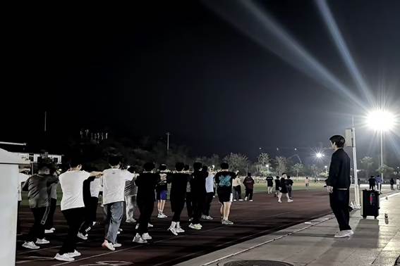 亲爱的同学们,在逐梦的校园时光里,你是否也曾悄悄憧憬身着飒爽军装,英姿勃发地守护祖国山河?当看到英雄们的传奇故事心底那团火焰是否悄然跳动?此刻,逐梦军旅的大门已向你敞开。欢迎加入逐梦军旅营,见证蜕变的力量!夜晚的运动场上,同学们正在进行格斗术训练。在教练的指导下,他们列队整齐,出拳有力,动作整齐划一,展现出青春的活力与拼搏精神。当手机屏幕亮起运动数据,青春的热情在此汇聚。每串数字都是拼搏印记,我