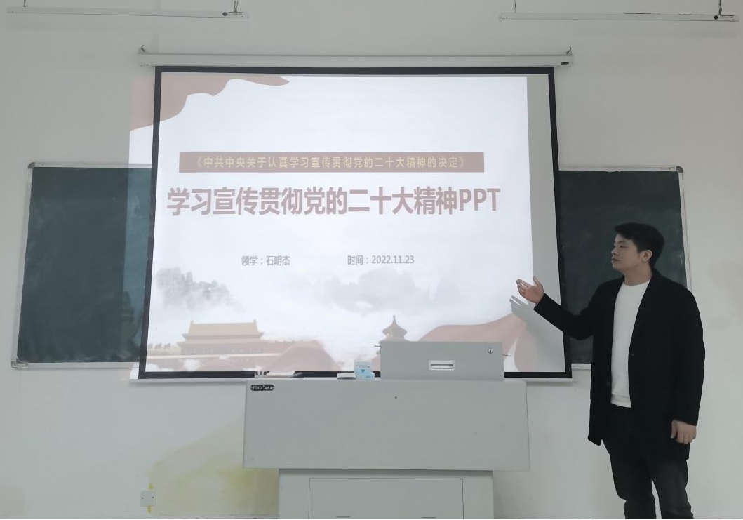 接着,由通识学院党支部书记石明杰同志领学《学习宣传贯彻党的“二十大”精神》,他呼吁党支部全体党员都要加强学习,扛起政治责任,深刻领会,做到知行合一,终端见效,切实把“二十大”的精神转化为工作动力。
